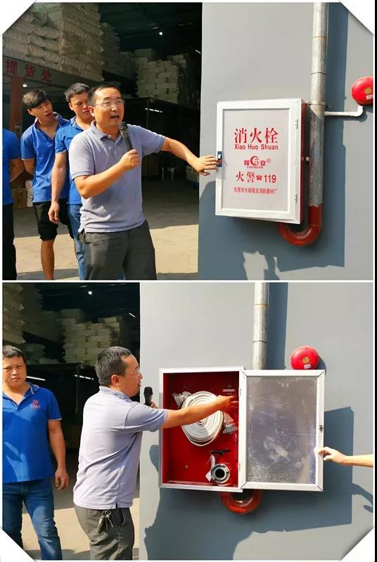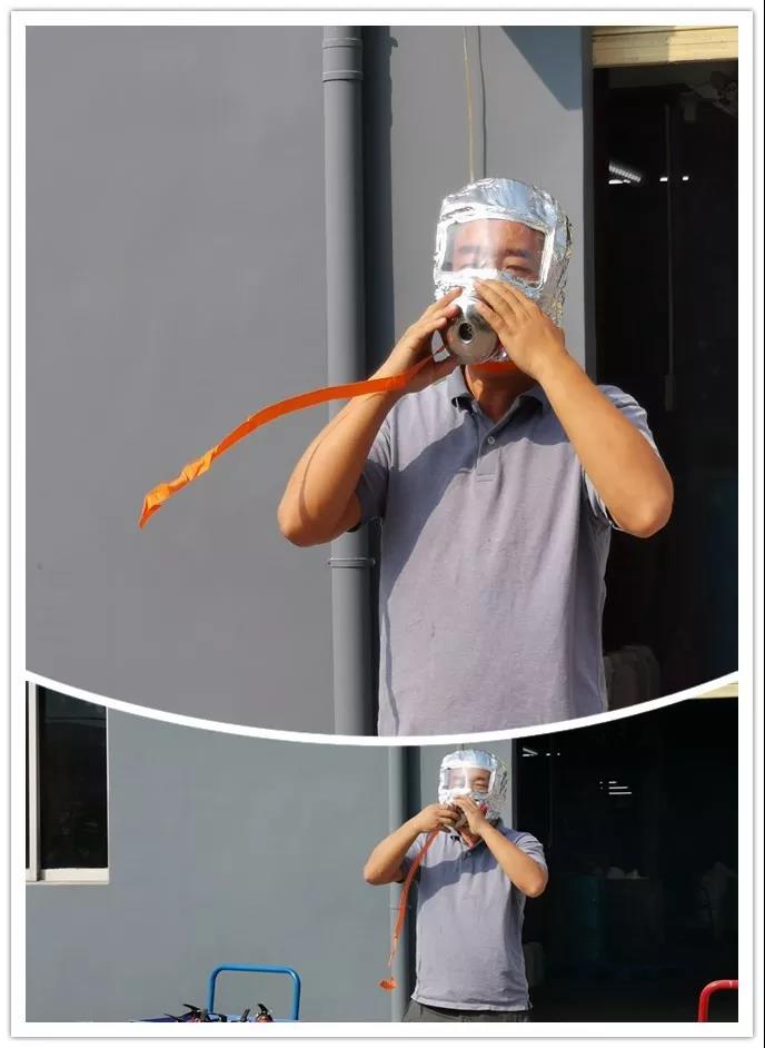 搶答完成后,負責公司消防器材維護的大劉,教大家如何正確使用滅火器、防火面罩及消防栓。