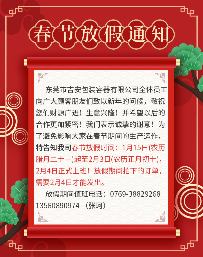 新春復(fù)始,萬象更新!非常感謝各位新老客戶長期以來對吉安容器的鼎力支持與關(guān)照,在新春來臨之際,東莞市吉安包裝容器有限公司全體員工向廣大顧客朋友們致以新年的問候,敬祝您們財(cái)源廣進(jìn)!生意興隆!并希望以后的合作更加緊密!我們表示誠摯的謝意!