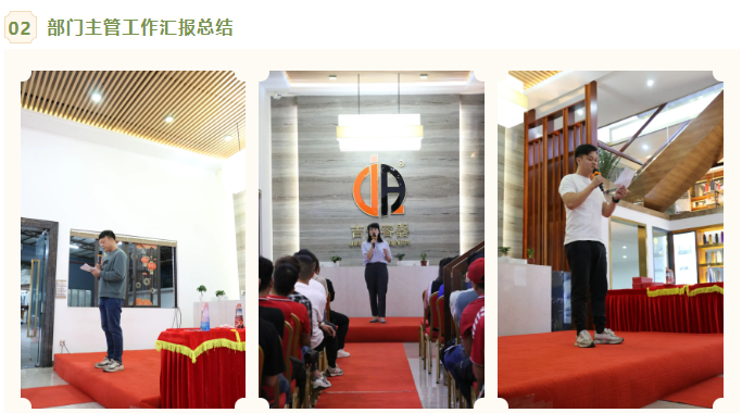 首先舉行每月部門表彰及總結大會,對各部門工作表現突出的同事進行表彰并頒發獎金,同時部門主管對工作進行總結及工作計劃制定;我們以優秀的同事為榜樣,為他們取得的成績喝彩,并以此為目標爭取自己能成為下一個獲獎人;從部門主管的總結中認知以往工作中的不足,取長補短,以奮斗為燈,方能明確前行的方向,直至成功。