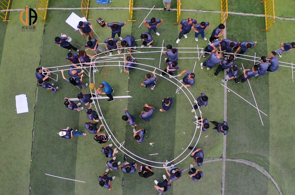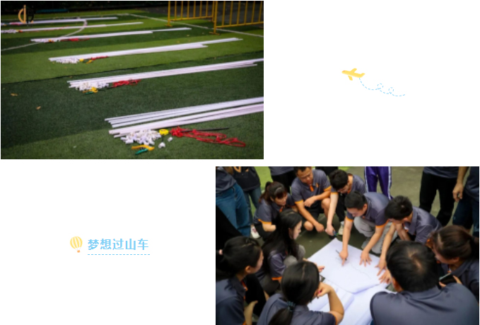 “夢想過山車”結合過山車的主題,來挑戰每一位學員的決心和恒心。從智力、承受力、動手能力各方面給學員施加壓力,與團隊成員一起來設計和建造這個世界上最令人興奮和最具創意的過山車。全隊所有隊員利用現有的道具搭建一個總長不少于10米高不小低于1.5米的過山車,且包含起點、直行、360度大循環、不少于一個的上坡及下坡、最后以不低于35公分為終點,要保證籃球從從起點最高點運行到最低處,且在中途球不可以躍出跑道。每組可以用官方提供的道具來分組拼裝。