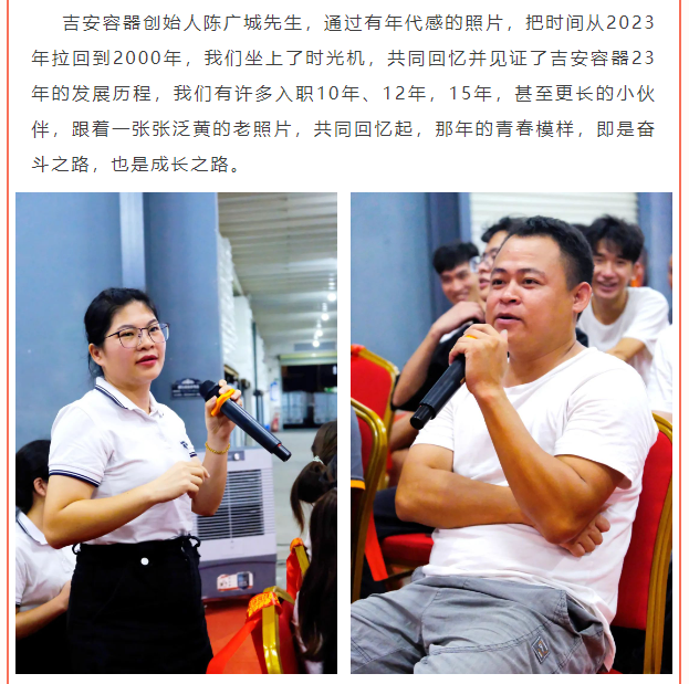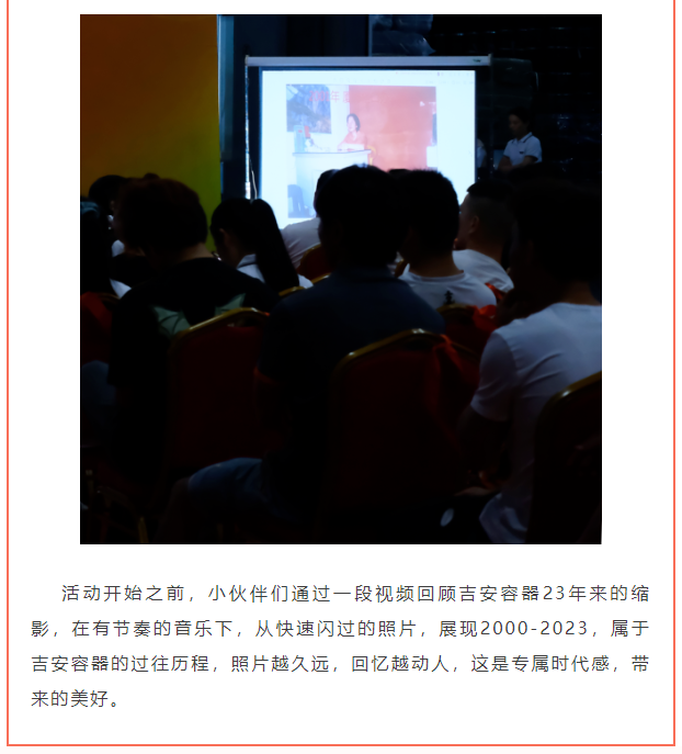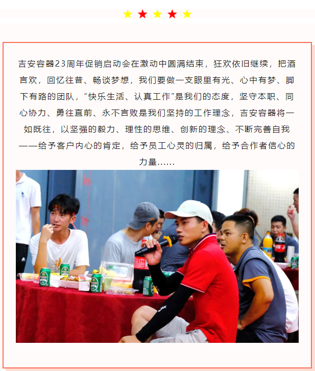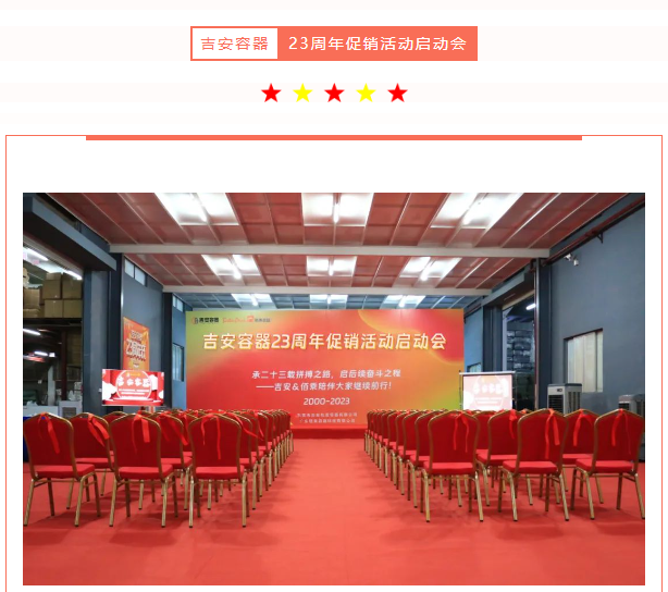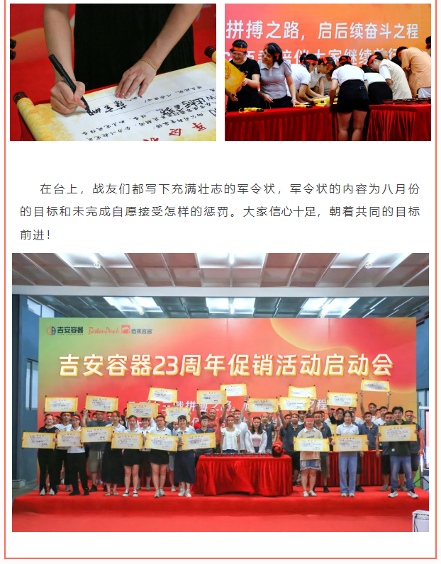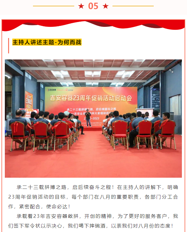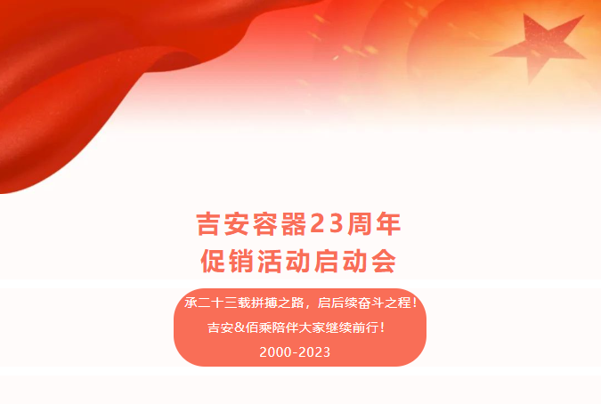 歲月如歌,風霜如畫。轉眼間,吉安容器陪伴大家度過了8000多個日夜。為感恩回饋23年來,一路支持與信任的新老客戶,吉安容器23周年促銷活動啟動會在物管部二區順利舉行。啟動會分為六個環節:視頻啟動、才藝表演、回憶過往、為何而戰、簽軍令狀、喝摔碗酒。23年里,吉安容器在大家堅持不懈的努力奮斗中不斷前行。我們有太多美好回憶,一起經歷過成長、美好與感動。接下來帶大家回顧吉安23周年促銷活動啟動會的每一個精彩環節。