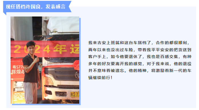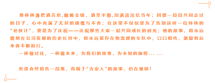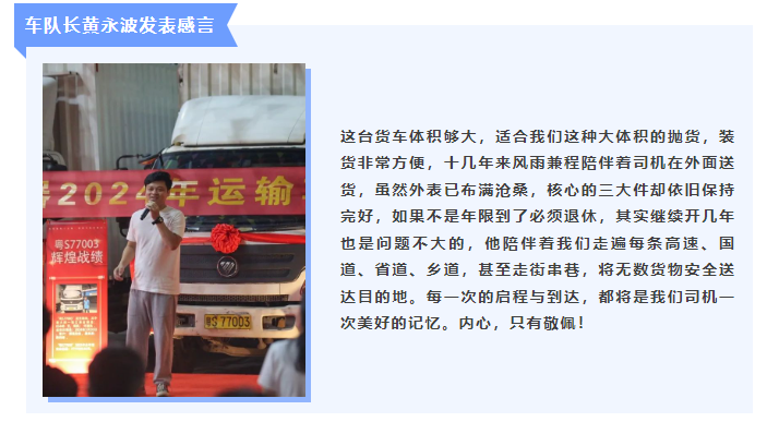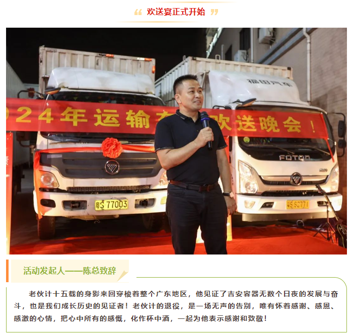 在這個金秋送爽、碩果累累的季節(jié)里,我們?yōu)橐晃惶厥獾摹袄蠁T工”舉辦了一場溫馨、隆重且別開生面的“退休歡送會”。 這次的主角,是吉安容器物流部的一名“老伙計”,他是一輛總長8.48米的廂式貨車,勤懇服役十五年后,出色完成他的使命,光榮退休;他是吉安車隊發(fā)展史的一個縮影,也是我們吉安故事里,其中一個主角之一,我們帶著不舍與15載的回憶,決定在這個特別的時刻、為特別的“他”,舉辦一場“歡送宴”。