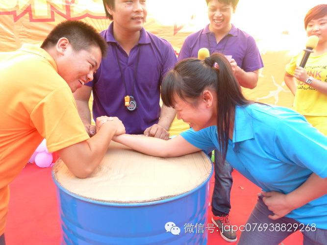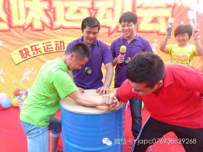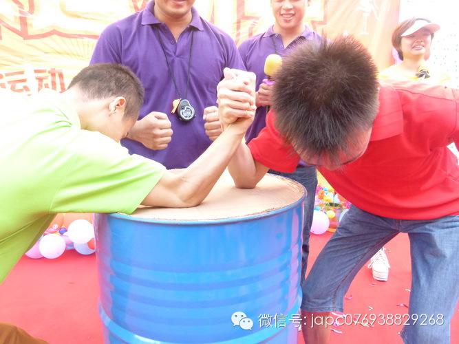 首先進行的是吉安容器運動會必不可少的項目——“辦手腕”,比賽規(guī)則是:1、參賽選手必須使用右手進行比賽。2、比賽時,兩位選手分別坐在桌子兩側,雙方必須同時將右手放到比賽指定位置,左手握拳置于背后,其余部位不得與臺面接觸,不得借助外力。3、雙方選手兩個大拇指緊緊相扣,在裁判發(fā)令后,誰先把對方的手掰倒,手背必須碰到桌面即為獲勝。4、在比賽過程中,雙方選手雙腳不能移動,每個人的肘部不能脫離桌面,身體不能來回劇烈晃動。5、二人對決中勝出者團隊積1分,負者不積分。