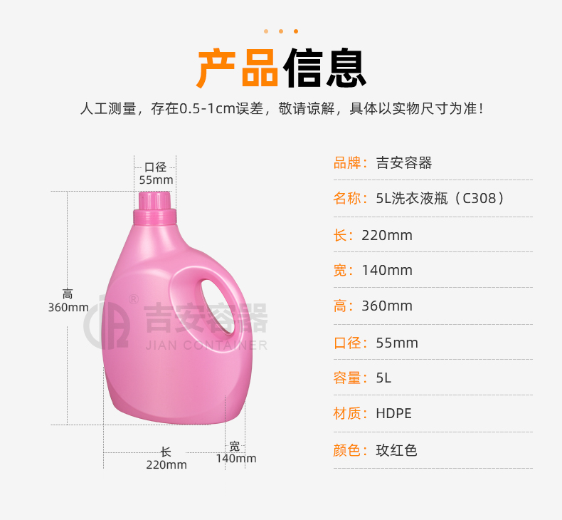 東莞市吉安包裝容器有限公司創立于2000年8月1日,是中國知名品牌企業。已通過ISO 9001質量管理體系資質認證,加入了中國中空協會,并獲得《中國知名品牌》,《國家標準合格產品》,《全國重合同守信用AAA級企業》,《質量.服務.誠信AAA企業》等榮譽稱號。根據材質的不同,我們的產品分為塑料容器、鐵質容器、鋁材容器、玻璃容器、紙質容器等五大類。按產品的名稱分為塑料桶、塑料瓶、包裝桶、涂料桶、機油桶、油脂桶、化工罐、膠水瓶、鐵桶、鐵罐、鋁瓶、鋁罐、阻隔瓶、高阻隔瓶等,容量從3ML至1000L多種規格,多種款式。適合包裝的產品包括:化學試劑、化工原料、化工助劑、飼料添加劑、油墨、油漆、樹脂農藥、日用化學品、聚氨脂、膠粘劑,廣泛應用于化工、建筑、食品、醫療、生物等各領域。