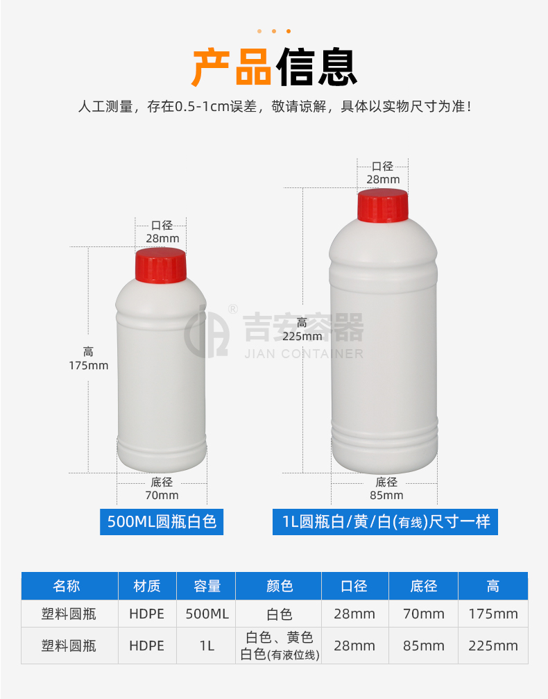 東莞市吉安包裝容器有限公司創立于2000年8月1日,是中國知名品牌企業。已通過ISO 9001質量管理體系資質認證,加入了中國中空協會,并獲得《中國知名品牌》,《國家標準合格產品》,《全國重合同守信用AAA級企業》,《質量.服務.誠信AAA企業》等榮譽稱號。根據材質的不同,我們的產品分為塑料容器、鐵質容器、鋁材容器、玻璃容器、紙質容器等五大類。按產品的名稱分為塑料桶、塑料瓶、包裝桶、涂料桶、機油桶、油脂桶、化工罐、膠水瓶、鐵桶、鐵罐、鋁瓶、鋁罐、阻隔瓶、高阻隔瓶等,容量從3ML至1000L多種規格,多種款式。適合包裝的產品包括:化學試劑、化工原料、化工助劑、飼料添加劑、油墨、油漆、樹脂農藥、日用化學品、聚氨脂、膠粘劑,廣泛應用于化工、建筑、食品、醫療、生物等各領域。