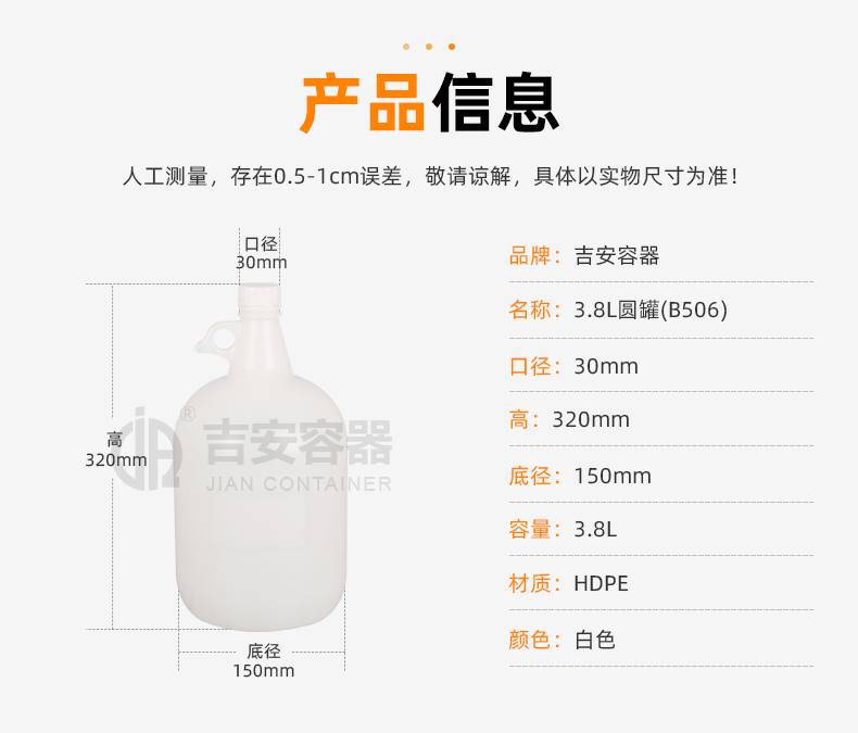 東莞市吉安包裝容器有限公司創立于2000年8月1日,是中國知名品牌企業。已通過ISO 9001質量管理體系資質認證,加入了中國中空協會,并獲得《中國知名品牌》,《國家標準合格產品》,《全國重合同守信用AAA級企業》,《質量.服務.誠信AAA企業》等榮譽稱號。根據材質的不同,我們的產品分為塑料容器、鐵質容器、鋁材容器、玻璃容器、紙質容器等五大類。按產品的名稱分為塑料桶、塑料瓶、包裝桶、涂料桶、機油桶、油脂桶、化工罐、膠水瓶、鐵桶、鐵罐、鋁瓶、鋁罐、阻隔瓶、高阻隔瓶等,容量從3ML至1000L多種規格,多種款式。適合包裝的產品包括:化學試劑、化工原料、化工助劑、飼料添加劑、油墨、油漆、樹脂農藥、日用化學品、聚氨脂、膠粘劑,廣泛應用于化工、建筑、食品、醫療、生物等各領域。