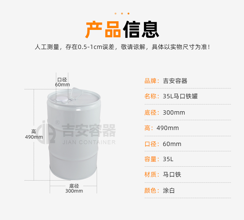 東莞市吉安包裝容器有限公司創立于2000年8月1日,是中國知名品牌企業。已通過ISO 9001質量管理體系資質認證,加入了中國中空協會,并獲得《中國知名品牌》,《國家標準合格產品》,《全國重合同守信用AAA級企業》,《質量.服務.誠信AAA企業》等榮譽稱號。根據材質的不同,我們的產品分為塑料容器、鐵質容器、鋁材容器、玻璃容器、紙質容器等五大類。按產品的名稱分為塑料桶、塑料瓶、包裝桶、涂料桶、機油桶、油脂桶、化工罐、膠水瓶、鐵桶、鐵罐、鋁瓶、鋁罐、阻隔瓶、高阻隔瓶等,容量從3ML至1000L多種規格,多種款式。適合包裝的產品包括:化學試劑、化工原料、化工助劑、飼料添加劑、油墨、油漆、樹脂農藥、日用化學品、聚氨脂、膠粘劑,廣泛應用于化工、建筑、食品、醫療、生物等各領域。
