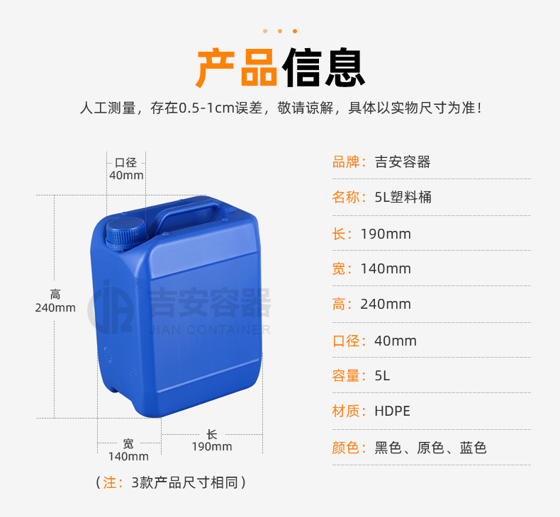 小口塑料桶:采用全新聚乙烯原料吹塑工藝制作而成,具有耐腐蝕,耐酸堿特性,小口設計密封性能強,廣泛應用于化工、清潔、食品、添加劑、汽車等各行業液體包裝。