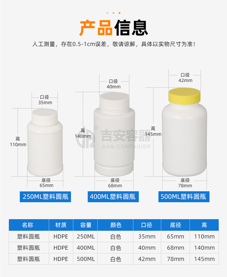 東莞市吉安包裝容器有限公司創立于2000年8月1日,是中國知名品牌企業。已通過ISO 9001質量管理體系資質認證,加入了中國中空協會,并獲得《中國知名品牌》,《國家標準合格產品》,《全國重合同守信用AAA級企業》,《質量.服務.誠信AAA企業》等榮譽稱號。根據材質的不同,我們的產品分為塑料容器、鐵質容器、鋁材容器、玻璃容器、紙質容器等五大類。按產品的名稱分為塑料桶、塑料瓶、包裝桶、涂料桶、機油桶、油脂桶、化工罐、膠水瓶、鐵桶、鐵罐、鋁瓶、鋁罐、阻隔瓶、高阻隔瓶等,容量從3ML至1000L多種規格,多種款式。適合包裝的產品包括:化學試劑、化工原料、化工助劑、飼料添加劑、油墨、油漆、樹脂農藥、日用化學品、聚氨脂、膠粘劑,廣泛應用于化工、建筑、食品、醫療、生物等各領域。