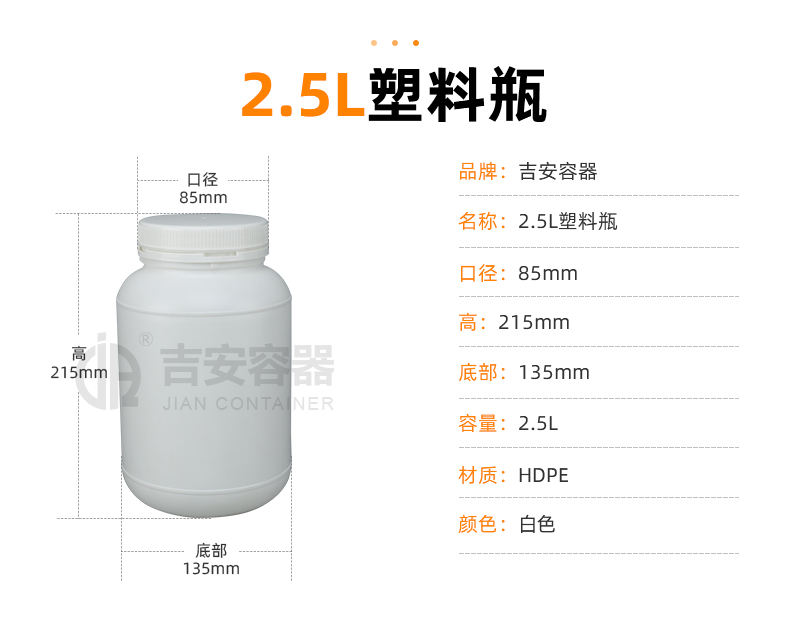 東莞市吉安包裝容器有限公司創立于2000年8月1日,是中國知名品牌企業。已通過ISO 9001質量管理體系資質認證,加入了中國中空協會,并獲得《中國知名品牌》,《國家標準合格產品》,《全國重合同守信用AAA級企業》,《質量.服務.誠信AAA企業》等榮譽稱號。根據材質的不同,我們的產品分為塑料容器、鐵質容器、鋁材容器、玻璃容器、紙質容器等五大類。按產品的名稱分為塑料桶、塑料瓶、包裝桶、涂料桶、機油桶、油脂桶、化工罐、膠水瓶、鐵桶、鐵罐、鋁瓶、鋁罐、阻隔瓶、高阻隔瓶等,容量從3ML至1000L多種規格,多種款式。適合包裝的產品包括:化學試劑、化工原料、化工助劑、飼料添加劑、油墨、油漆、樹脂農藥、日用化學品、聚氨脂、膠粘劑,廣泛應用于化工、建筑、食品、醫療、生物等各領域。