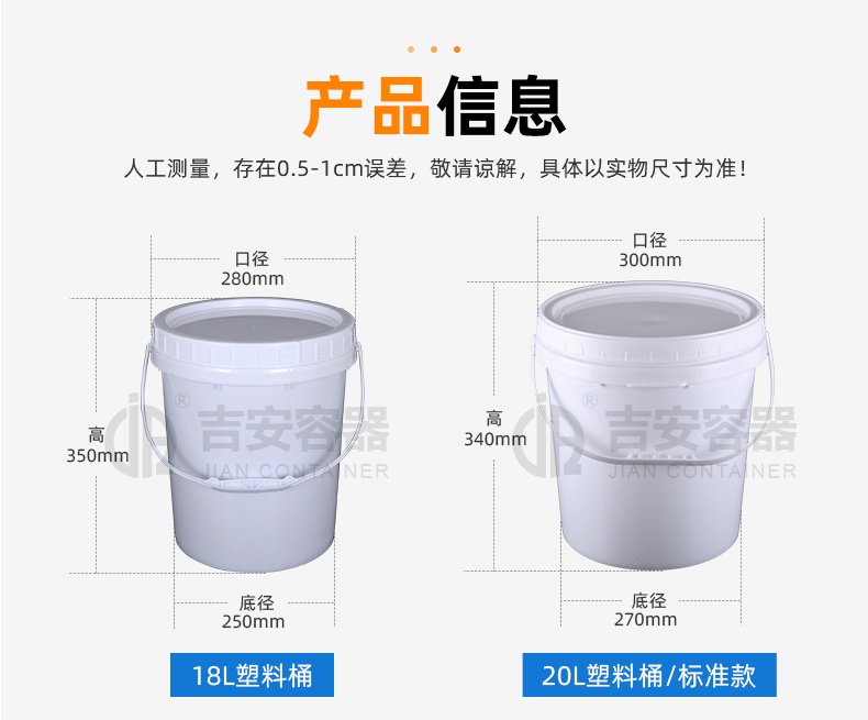 東莞市吉安包裝容器有限公司創立于2000年8月1日,是中國知名品牌企業。已通過ISO 9001質量管理體系資質認證,加入了中國中空協會,并獲得《中國知名品牌》,《國家標準合格產品》,《全國重合同守信用AAA級企業》,《質量.服務.誠信AAA企業》等榮譽稱號。根據材質的不同,我們的產品分為塑料容器、鐵質容器、鋁材容器、玻璃容器、紙質容器等五大類。按產品的名稱分為塑料桶、塑料瓶、包裝桶、涂料桶、機油桶、油脂桶、化工罐、膠水瓶、鐵桶、鐵罐、鋁瓶、鋁罐、阻隔瓶、高阻隔瓶等,容量從3ML至1000L多種規格,多種款式。適合包裝的產品包括:化學試劑、化工原料、化工助劑、飼料添加劑、油墨、油漆、樹脂農藥、日用化學品、聚氨脂、膠粘劑,廣泛應用于化工、建筑、食品、醫療、生物等各領域。
