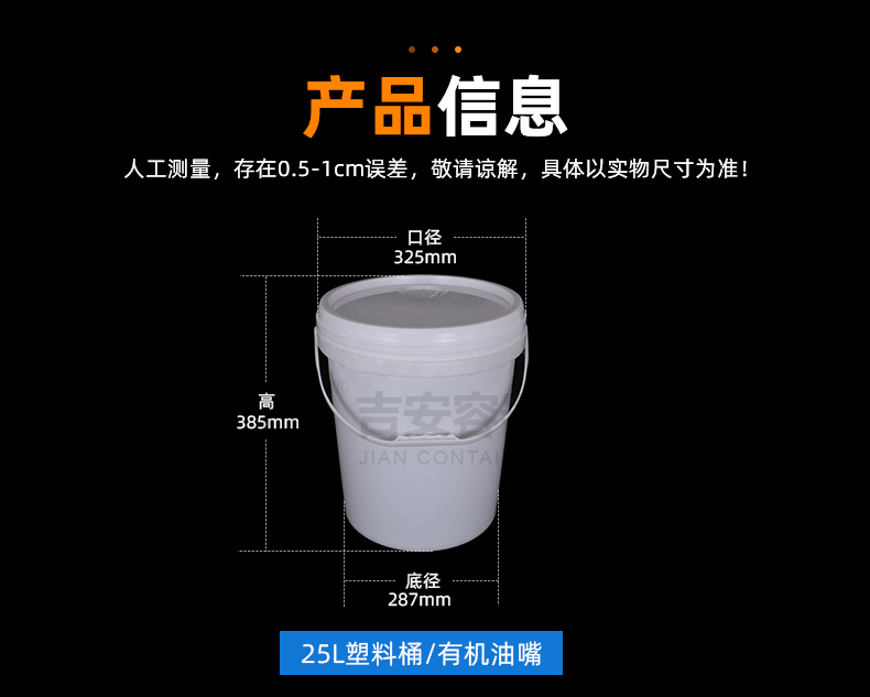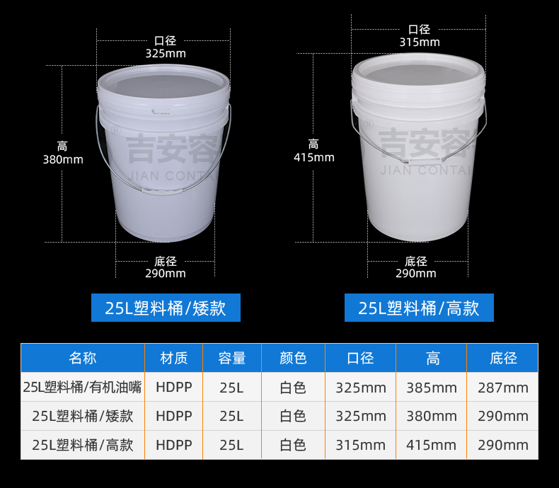 東莞市吉安包裝容器有限公司創立于2000年8月1日,是中國知名品牌企業。已通過ISO 9001質量管理體系資質認證,加入了中國中空協會,并獲得《中國知名品牌》,《國家標準合格產品》,《全國重合同守信用AAA級企業》,《質量.服務.誠信AAA企業》等榮譽稱號。根據材質的不同,我們的產品分為塑料容器、鐵質容器、鋁材容器、玻璃容器、紙質容器等五大類。按產品的名稱分為塑料桶、塑料瓶、包裝桶、涂料桶、機油桶、油脂桶、化工罐、膠水瓶、鐵桶、鐵罐、鋁瓶、鋁罐、阻隔瓶、高阻隔瓶等,容量從3ML至1000L多種規格,多種款式。適合包裝的產品包括:化學試劑、化工原料、化工助劑、飼料添加劑、油墨、油漆、樹脂農藥、日用化學品、聚氨脂、膠粘劑,廣泛應用于化工、建筑、食品、醫療、生物等各領域。