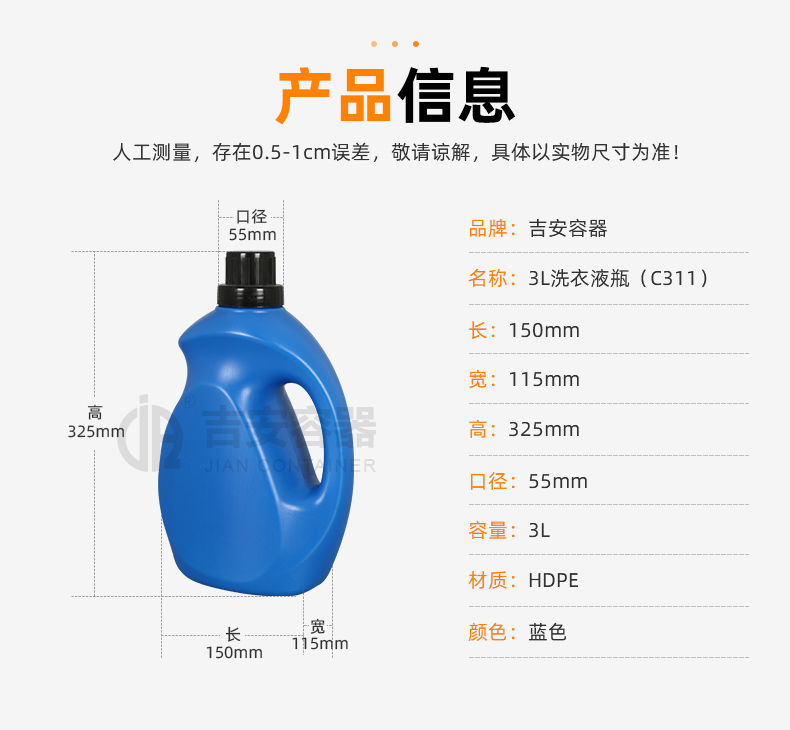 東莞市吉安包裝容器有限公司創立于2000年8月1日,是中國知名品牌企業。已通過ISO 9001質量管理體系資質認證,加入了中國中空協會,并獲得《中國知名品牌》,《國家標準合格產品》,《全國重合同守信用AAA級企業》,《質量.服務.誠信AAA企業》等榮譽稱號。根據材質的不同,我們的產品分為塑料容器、鐵質容器、鋁材容器、玻璃容器、紙質容器等五大類。按產品的名稱分為塑料桶、塑料瓶、包裝桶、涂料桶、機油桶、油脂桶、化工罐、膠水瓶、鐵桶、鐵罐、鋁瓶、鋁罐、阻隔瓶、高阻隔瓶等,容量從3ML至1000L多種規格,多種款式。適合包裝的產品包括:化學試劑、化工原料、化工助劑、飼料添加劑、油墨、油漆、樹脂農藥、日用化學品、聚氨脂、膠粘劑,廣泛應用于化工、建筑、食品、醫療、生物等各領域。