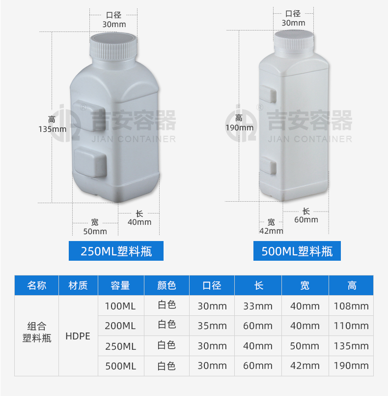 東莞市吉安包裝容器有限公司創立于2000年8月1日,是中國知名品牌企業。已通過ISO 9001質量管理體系資質認證,加入了中國中空協會,并獲得《中國知名品牌》,《國家標準合格產品》,《全國重合同守信用AAA級企業》,《質量.服務.誠信AAA企業》等榮譽稱號。根據材質的不同,我們的產品分為塑料容器、鐵質容器、鋁材容器、玻璃容器、紙質容器等五大類。按產品的名稱分為塑料桶、塑料瓶、包裝桶、涂料桶、機油桶、油脂桶、化工罐、膠水瓶、鐵桶、鐵罐、鋁瓶、鋁罐、阻隔瓶、高阻隔瓶等,容量從3ML至1000L多種規格,多種款式。適合包裝的產品包括:化學試劑、化工原料、化工助劑、飼料添加劑、油墨、油漆、樹脂農藥、日用化學品、聚氨脂、膠粘劑,廣泛應用于化工、建筑、食品、醫療、生物等各領域。