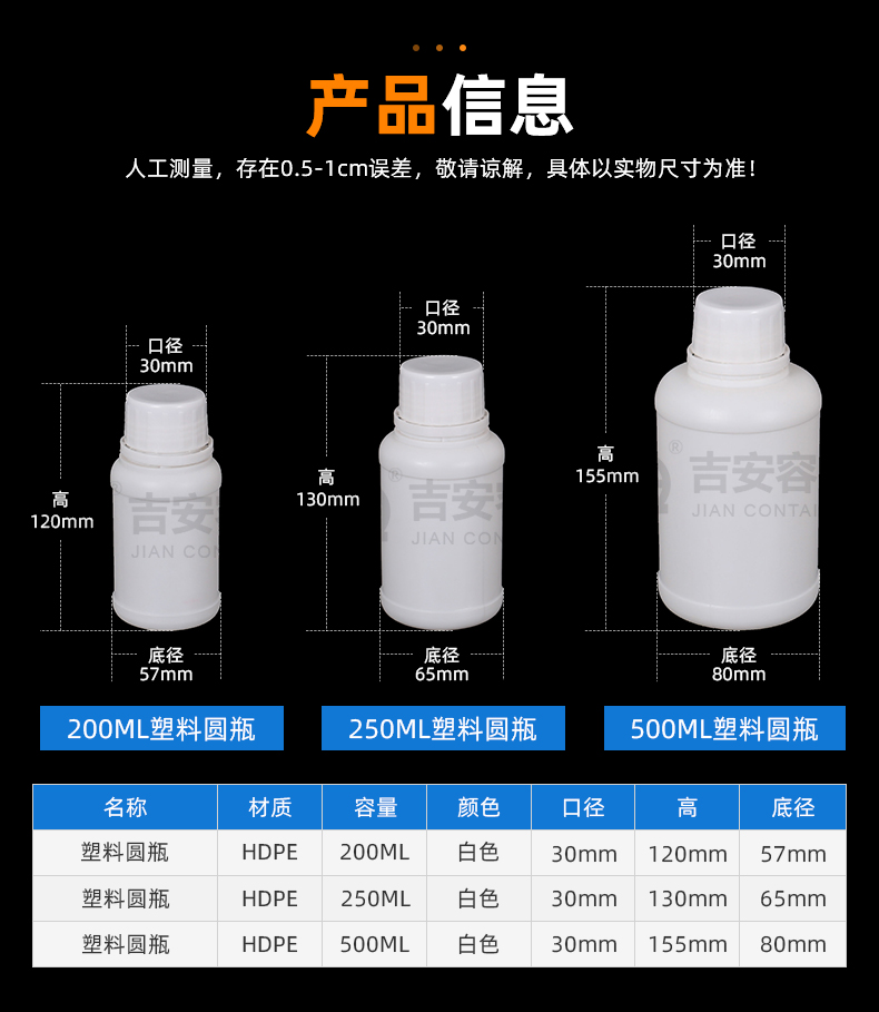 東莞市吉安包裝容器有限公司創立于2000年8月1日,是中國知名品牌企業。已通過ISO 9001質量管理體系資質認證,加入了中國中空協會,并獲得《中國知名品牌》,《國家標準合格產品》,《全國重合同守信用AAA級企業》,《質量.服務.誠信AAA企業》等榮譽稱號。根據材質的不同,我們的產品分為塑料容器、鐵質容器、鋁材容器、玻璃容器、紙質容器等五大類。按產品的名稱分為塑料桶、塑料瓶、包裝桶、涂料桶、機油桶、油脂桶、化工罐、膠水瓶、鐵桶、鐵罐、鋁瓶、鋁罐、阻隔瓶、高阻隔瓶等,容量從3ML至1000L多種規格,多種款式。適合包裝的產品包括:化學試劑、化工原料、化工助劑、飼料添加劑、油墨、油漆、樹脂農藥、日用化學品、聚氨脂、膠粘劑,廣泛應用于化工、建筑、食品、醫療、生物等各領域。