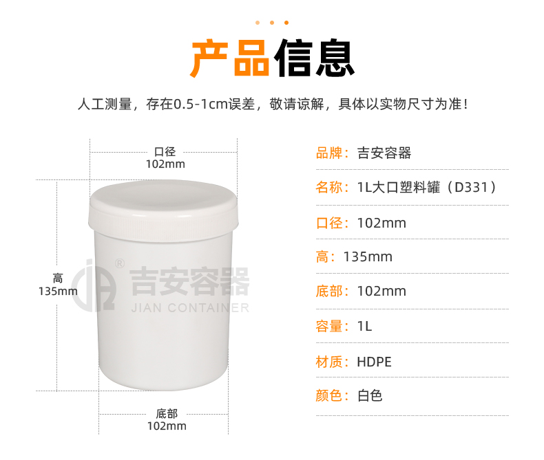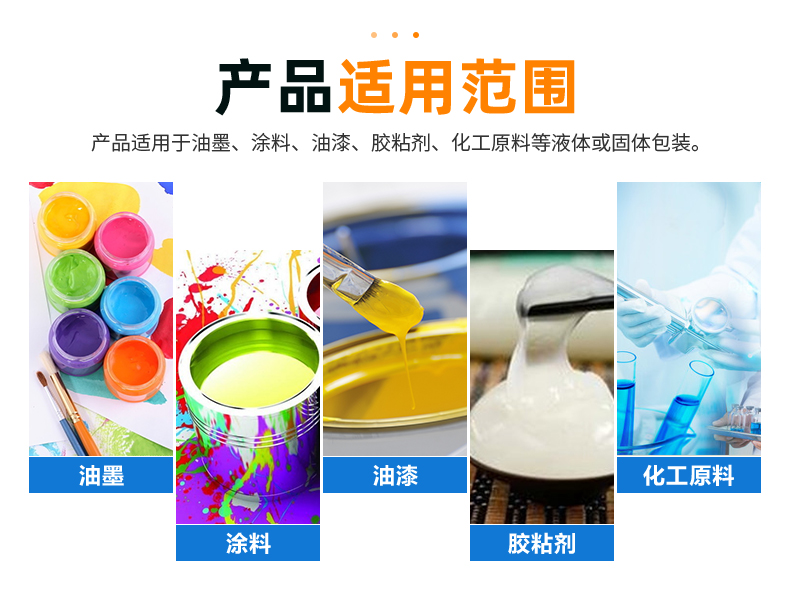 東莞市吉安包裝容器有限公司創立于2000年8月1日,是中國知名品牌企業。已通過ISO 9001質量管理體系資質認證,加入了中國中空協會,并獲得《中國知名品牌》,《國家標準合格產品》,《全國重合同守信用AAA級企業》,《質量.服務.誠信AAA企業》等榮譽稱號。根據材質的不同,我們的產品分為塑料容器、鐵質容器、鋁材容器、玻璃容器、紙質容器等五大類。按產品的名稱分為塑料桶、塑料瓶、包裝桶、涂料桶、機油桶、油脂桶、化工罐、膠水瓶、鐵桶、鐵罐、鋁瓶、鋁罐、阻隔瓶、高阻隔瓶等,容量從3ML至1000L多種規格,多種款式。適合包裝的產品包括:化學試劑、化工原料、化工助劑、飼料添加劑、油墨、油漆、樹脂農藥、日用化學品、聚氨脂、膠粘劑,廣泛應用于化工、建筑、食品、醫療、生物等各領域。