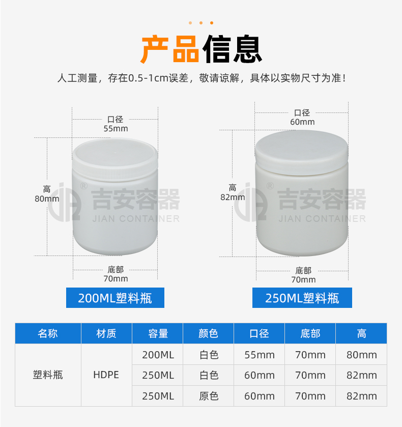 東莞市吉安包裝容器有限公司創立于2000年8月1日,是中國知名品牌企業。已通過ISO 9001質量管理體系資質認證,加入了中國中空協會,并獲得《中國知名品牌》,《國家標準合格產品》,《全國重合同守信用AAA級企業》,《質量.服務.誠信AAA企業》等榮譽稱號。根據材質的不同,我們的產品分為塑料容器、鐵質容器、鋁材容器、玻璃容器、紙質容器等五大類。按產品的名稱分為塑料桶、塑料瓶、包裝桶、涂料桶、機油桶、油脂桶、化工罐、膠水瓶、鐵桶、鐵罐、鋁瓶、鋁罐、阻隔瓶、高阻隔瓶等,容量從3ML至1000L多種規格,多種款式。適合包裝的產品包括:化學試劑、化工原料、化工助劑、飼料添加劑、油墨、油漆、樹脂農藥、日用化學品、聚氨脂、膠粘劑,廣泛應用于化工、建筑、食品、醫療、生物等各領域。