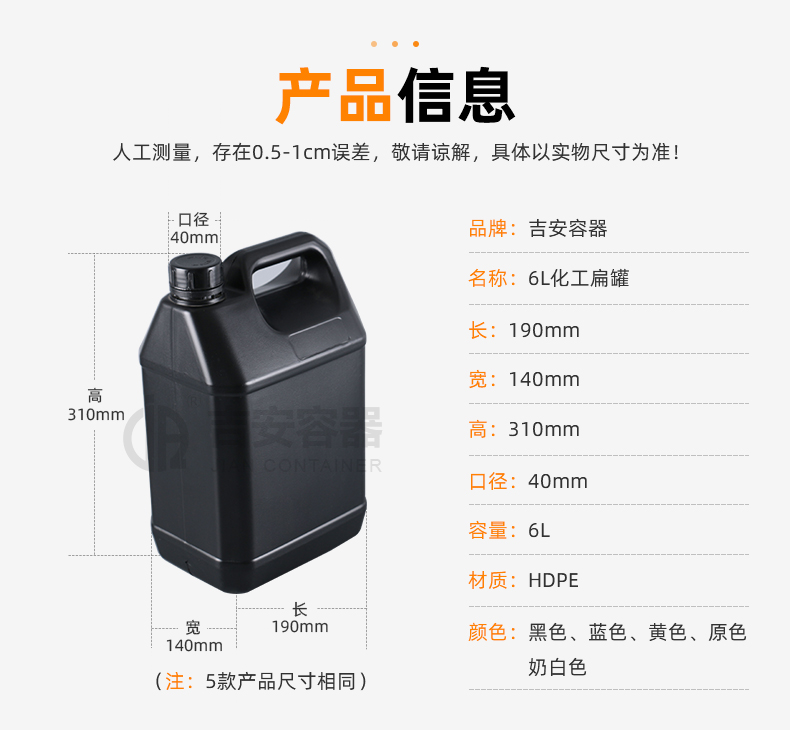 塑料扁罐采用HDPE原材料吹塑而成,具有良好的耐酸堿性及密封性,方形設計方便堆放,不占用空間,美觀實用。具備不變形,使用方便等特征,可根據客戶需求做印刷及貼膜,產品適用于尿素、機油、汽油、清洗劑、化工助劑、食品添加劑等液體包裝。