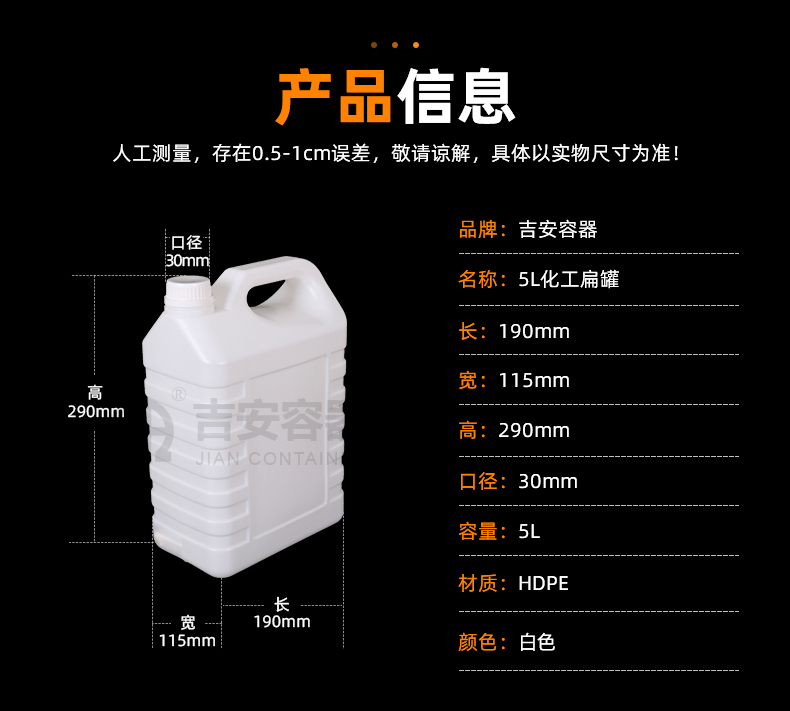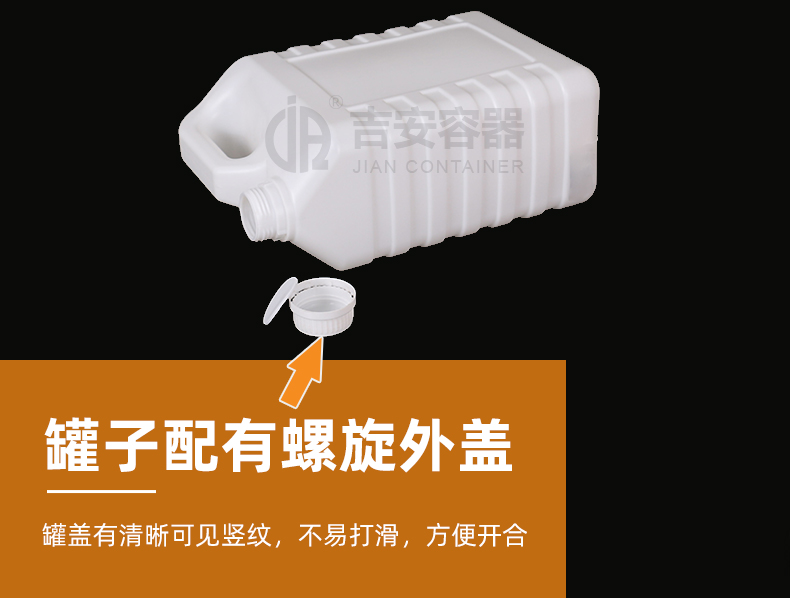塑料扁罐采用HDPE原材料吹塑而成,具有良好的耐酸堿性及密封性,方形設計方便堆放,不占用空間,美觀實用。具備不變形,使用方便等特征,可根據客戶需求做印刷及貼膜,產品適用于尿素、機油、汽油、清洗劑、化工助劑、食品添加劑等液體包裝。