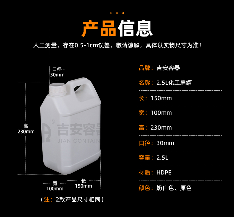 東莞市吉安包裝容器有限公司創立于2000年8月1日,是中國知名品牌企業。已通過ISO 9001質量管理體系資質認證,加入了中國中空協會,并獲得《中國知名品牌》,《國家標準合格產品》,《全國重合同守信用AAA級企業》,《質量.服務.誠信AAA企業》等榮譽稱號。根據材質的不同,我們的產品分為塑料容器、鐵質容器、鋁材容器、玻璃容器、紙質容器等五大類。按產品的名稱分為塑料桶、塑料瓶、包裝桶、涂料桶、機油桶、油脂桶、化工罐、膠水瓶、鐵桶、鐵罐、鋁瓶、鋁罐、阻隔瓶、高阻隔瓶等,容量從3ML至1000L多種規格,多種款式。適合包裝的產品包括:化學試劑、化工原料、化工助劑、飼料添加劑、油墨、油漆、樹脂農藥、日用化學品、聚氨脂、膠粘劑,廣泛應用于化工、建筑、食品、醫療、生物等各領域。
