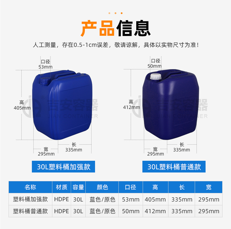 小口塑料桶:采用全新聚乙烯原料吹塑工藝制作而成,具有耐腐蝕,耐酸堿特性,小口設計密封性能強,廣泛應用于化工、清潔、食品、添加劑、汽車等各行業液體包裝。