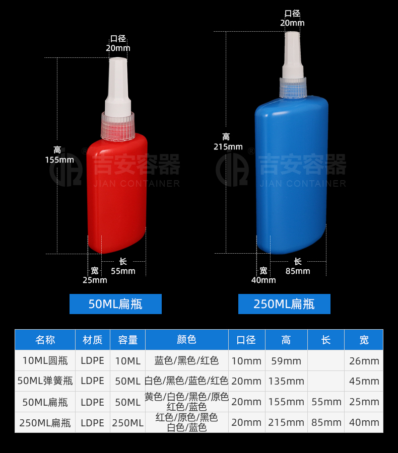 東莞市吉安包裝容器有限公司創立于2000年8月1日,是中國知名品牌企業。已通過ISO 9001質量管理體系資質認證,加入了中國中空協會,并獲得《中國知名品牌》,《國家標準合格產品》,《全國重合同守信用AAA級企業》,《質量.服務.誠信AAA企業》等榮譽稱號。根據材質的不同,我們的產品分為塑料容器、鐵質容器、鋁材容器、玻璃容器、紙質容器等五大類。按產品的名稱分為塑料桶、塑料瓶、包裝桶、涂料桶、機油桶、油脂桶、化工罐、膠水瓶、鐵桶、鐵罐、鋁瓶、鋁罐、阻隔瓶、高阻隔瓶等,容量從3ML至1000L多種規格,多種款式。適合包裝的產品包括:化學試劑、化工原料、化工助劑、飼料添加劑、油墨、油漆、樹脂農藥、日用化學品、聚氨脂、膠粘劑,廣泛應用于化工、建筑、食品、醫療、生物等各領域。