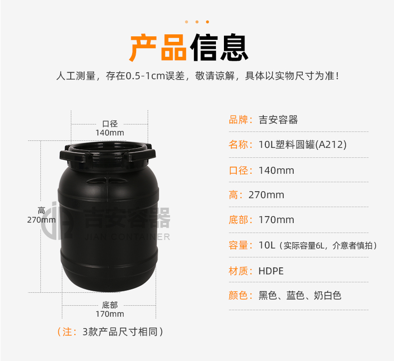 東莞市吉安包裝容器有限公司創立于2000年8月1日,是中國知名品牌企業。已通過ISO 9001質量管理體系資質認證,加入了中國中空協會,并獲得《中國知名品牌》,《國家標準合格產品》,《全國重合同守信用AAA級企業》,《質量.服務.誠信AAA企業》等榮譽稱號。根據材質的不同,我們的產品分為塑料容器、鐵質容器、鋁材容器、玻璃容器、紙質容器等五大類。按產品的名稱分為塑料桶、塑料瓶、包裝桶、涂料桶、機油桶、油脂桶、化工罐、膠水瓶、鐵桶、鐵罐、鋁瓶、鋁罐、阻隔瓶、高阻隔瓶等,容量從3ML至1000L多種規格,多種款式。適合包裝的產品包括:化學試劑、化工原料、化工助劑、飼料添加劑、油墨、油漆、樹脂農藥、日用化學品、聚氨脂、膠粘劑,廣泛應用于化工、建筑、食品、醫療、生物等各領域。