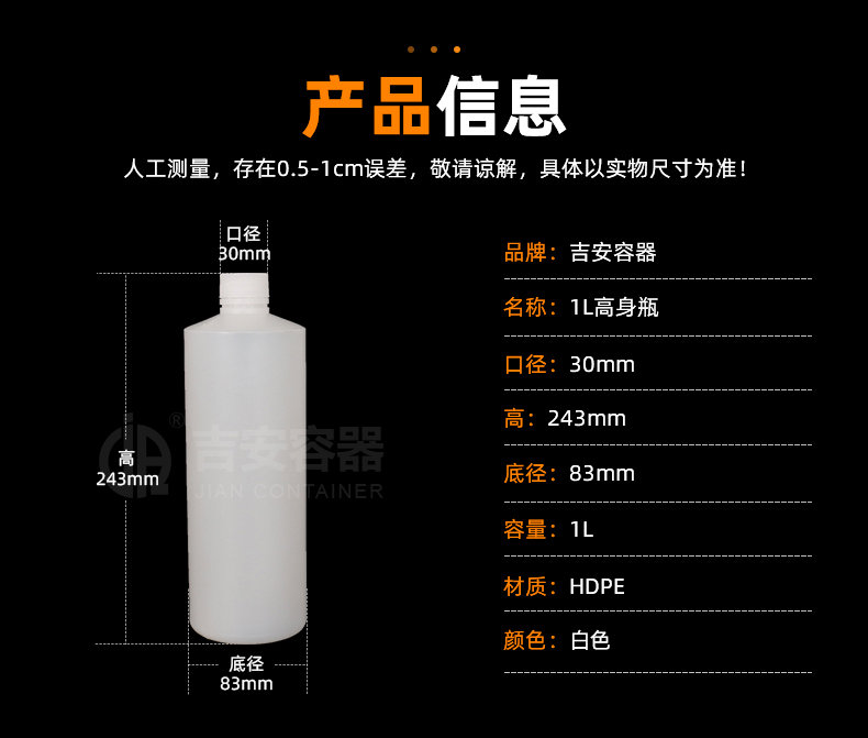 小口塑料瓶采用全新HDPE塑膠原料吹塑而成,具備韌性好、耐酸堿、耐腐蝕、不變形,密封性能佳等特點,可根據客戶需求定制、改色、產品適用于化工、清洗劑、醫藥、液體、食品、農業等各行業包裝。