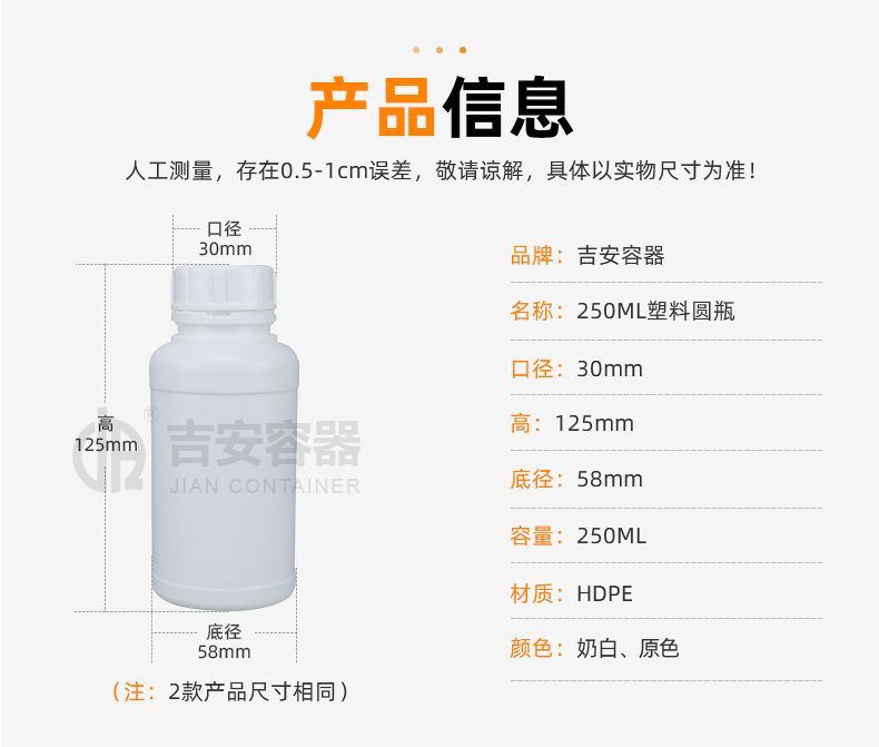 小口塑料瓶采用全新HDPE塑膠原料吹塑而成,具備韌性好、耐酸堿、耐腐蝕、不變形,密封性能佳等特點,可根據客戶需求定制、改色、產品適用于化工、清洗劑、醫藥、液體、食品、農業等各行業包裝。