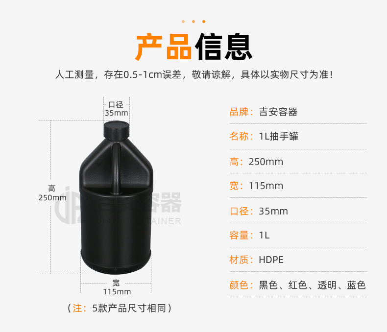 東莞市吉安包裝容器有限公司創立于2000年8月1日,是中國知名品牌企業。已通過ISO 9001質量管理體系資質認證,加入了中國中空協會,并獲得《中國知名品牌》,《國家標準合格產品》,《全國重合同守信用AAA級企業》,《質量.服務.誠信AAA企業》等榮譽稱號。根據材質的不同,我們的產品分為塑料容器、鐵質容器、鋁材容器、玻璃容器、紙質容器等五大類。按產品的名稱分為塑料桶、塑料瓶、包裝桶、涂料桶、機油桶、油脂桶、化工罐、膠水瓶、鐵桶、鐵罐、鋁瓶、鋁罐、阻隔瓶、高阻隔瓶等,容量從3ML至1000L多種規格,多種款式。適合包裝的產品包括:化學試劑、化工原料、化工助劑、飼料添加劑、油墨、油漆、樹脂農藥、日用化學品、聚氨脂、膠粘劑,廣泛應用于化工、建筑、食品、醫療、生物等各領域。