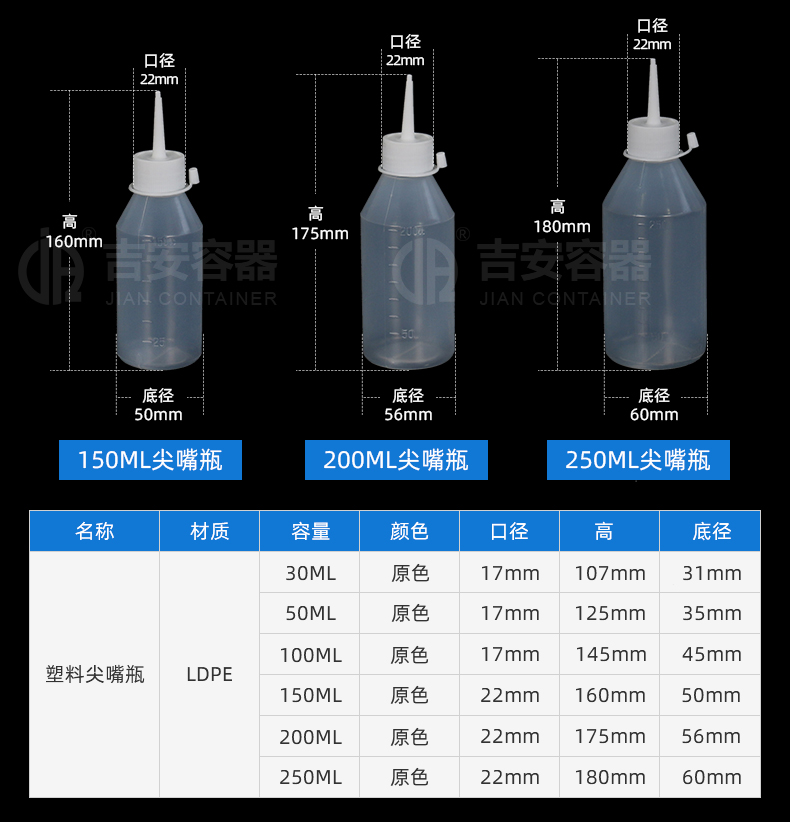東莞市吉安包裝容器有限公司創立于2000年8月1日,是中國知名品牌企業。已通過ISO 9001質量管理體系資質認證,加入了中國中空協會,并獲得《中國知名品牌》,《國家標準合格產品》,《全國重合同守信用AAA級企業》,《質量.服務.誠信AAA企業》等榮譽稱號。根據材質的不同,我們的產品分為塑料容器、鐵質容器、鋁材容器、玻璃容器、紙質容器等五大類。按產品的名稱分為塑料桶、塑料瓶、包裝桶、涂料桶、機油桶、油脂桶、化工罐、膠水瓶、鐵桶、鐵罐、鋁瓶、鋁罐、阻隔瓶、高阻隔瓶等,容量從3ML至1000L多種規格,多種款式。適合包裝的產品包括:化學試劑、化工原料、化工助劑、飼料添加劑、油墨、油漆、樹脂農藥、日用化學品、聚氨脂、膠粘劑,廣泛應用于化工、建筑、食品、醫療、生物等各領域。